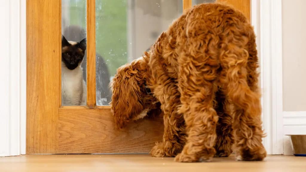 Frank’s role? To test whether trainee dogs can live peacefully in homes with cats.
