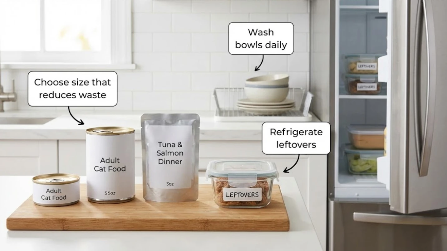 Pick a wet food you can feed consistently that’s labeled “complete & balanced” for your cat’s life stage, then choose packaging that minimizes leftovers, refrigerate promptly, and don’t leave wet food out for long at room temperature.