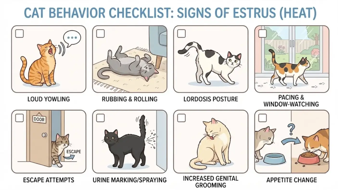 What you’ll notice: Loud yowling (often day and night), intense rubbing/rolling, restlessness, escape attempts, and the mating stance (hindquarters raised, tail to the side).