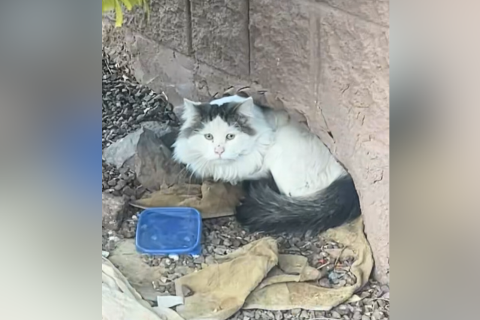 Spencer Tawes, 29, first noticed the tabby hunkered in a hole in the wall outside a Culver’s in Arizona. “There are a lot of stray cats in the area that I feed,” Spencer shared with Snugglesouls, “and I could tell with him specifically that he was likely abandoned.” Unlike the roamers who bolted at the sight of humans, this guy stayed put—scared but stationary, his fluffy fur a stark contrast to the down-turned mouth that screamed “I’ve been through it.”